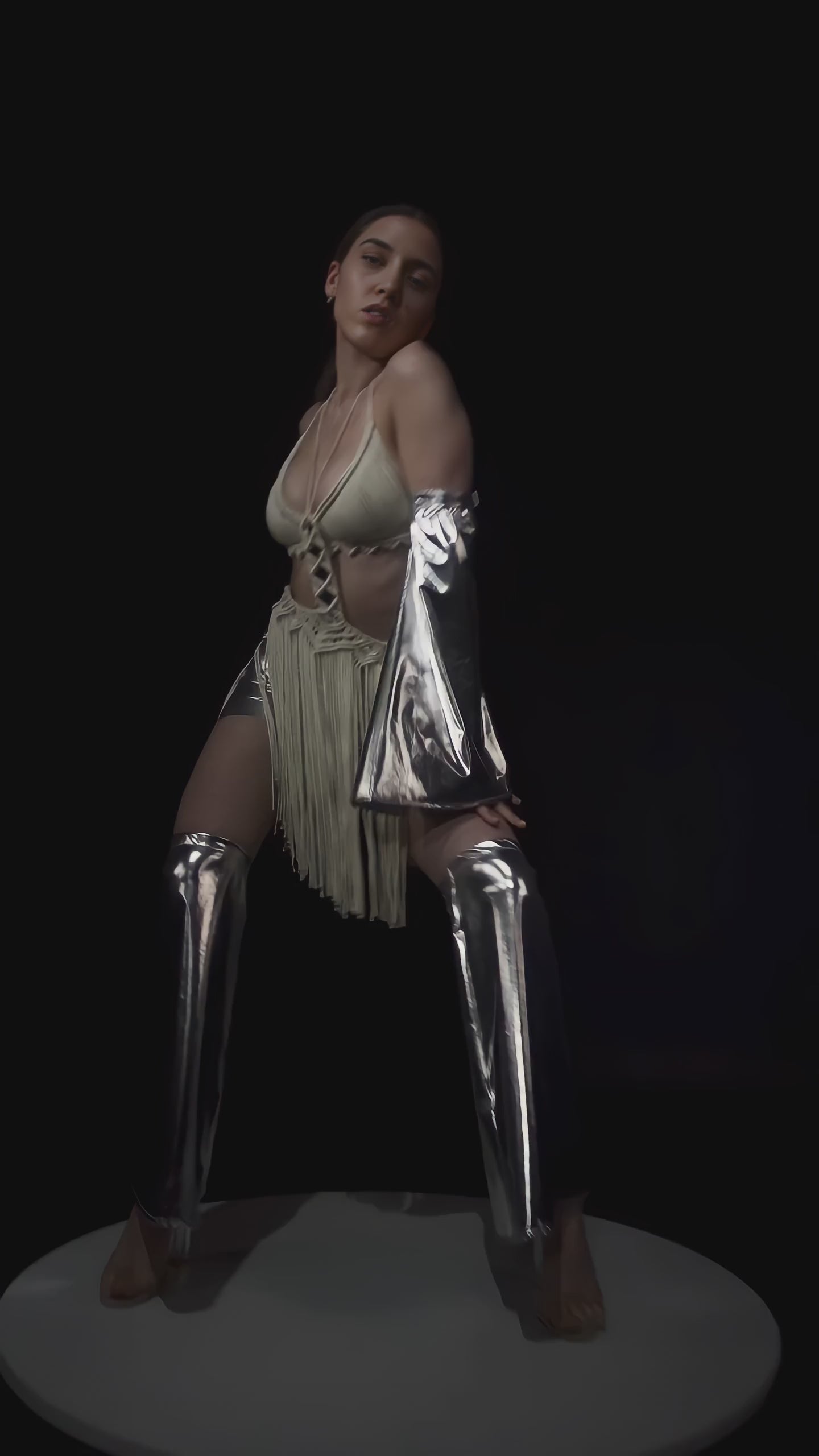 This macramé outfit was presented as part of our show collection and embodies a striking stage aesthetic. The set consists of a top and skirt, unified by mirrored elements that serve as bold accent details and catch the light beautifully in motion.